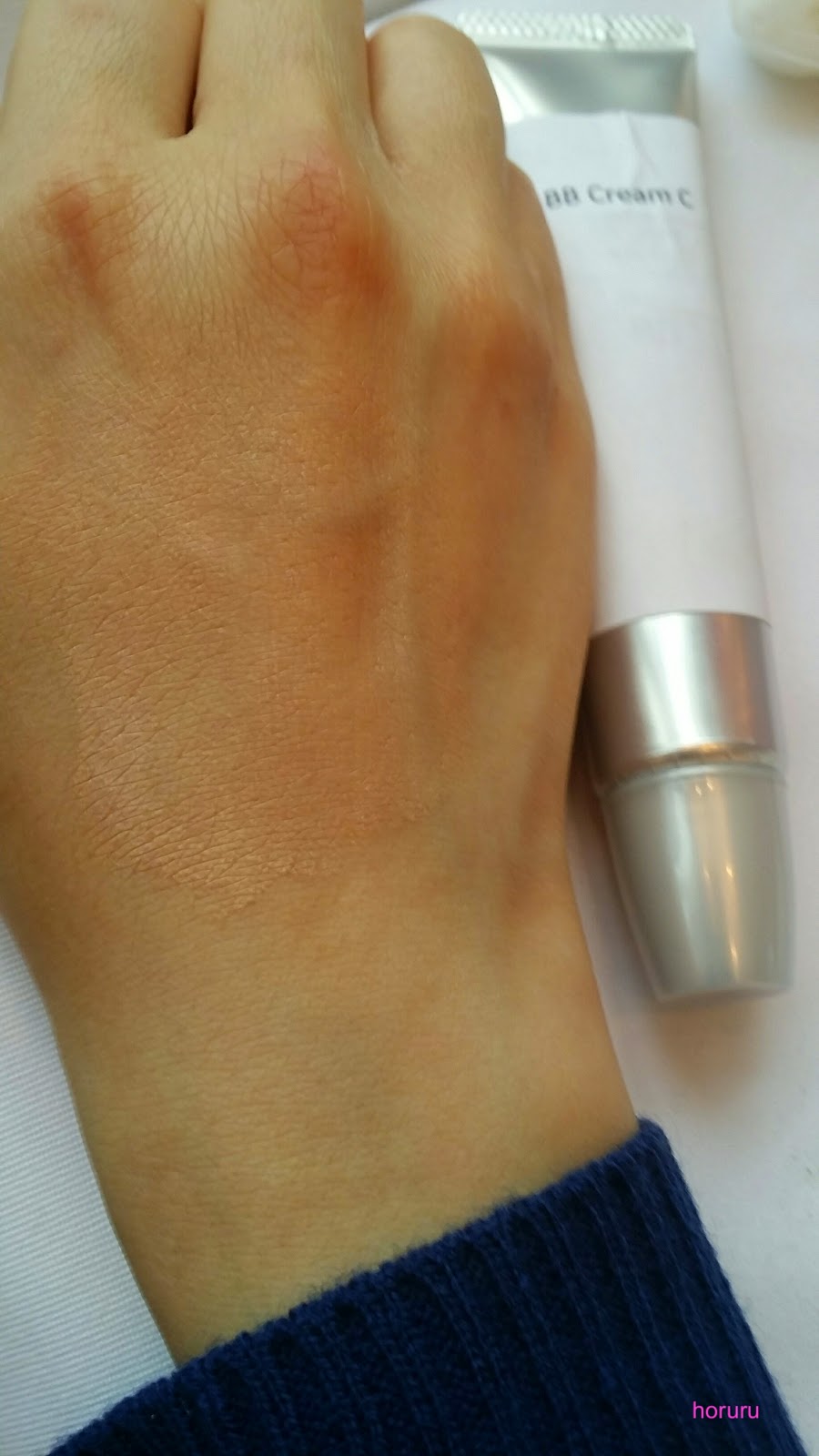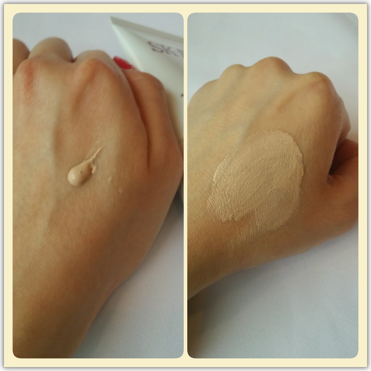 先在右手手背塗上SK-II環采鑽白 CC Cream及左手手背塗上另一品牌CC Cream 。