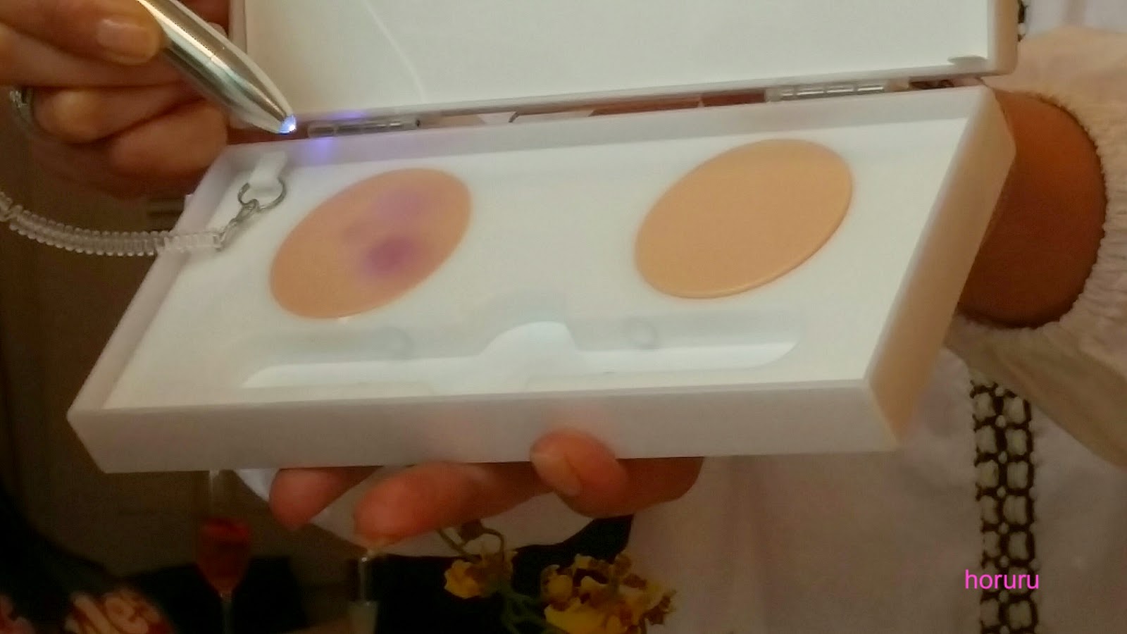 先在模擬皮膚一半塗上SK-II環采鑽白 CC Cream,並將模擬皮膚照射於UV燈之下,模仿人體肌膚在太陽下直接照射的情況。若顯現黑色影表示肌膚受到紫外線傷害,若顏色維持不變表示其紫外線保護程度愈高。結果顯示,塗上SK-II環采鑽白 CC Cream的人工皮膚顏色維持不變,其塗沒有塗上CC Cream 的模擬皮膚顯現黑色影。