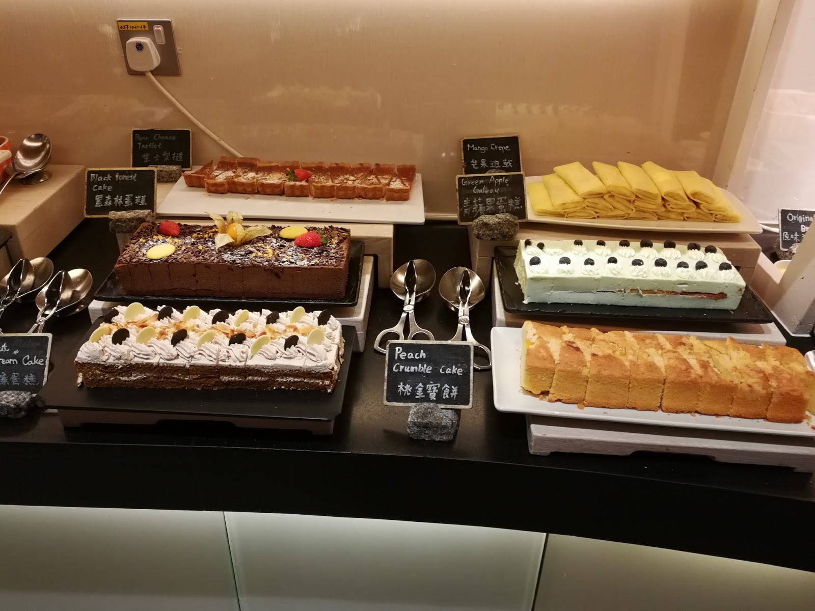 黑森林蛋糕、芝士梨撻、芒果班戟、青蘋果蛋糕及桃金寶餅。
