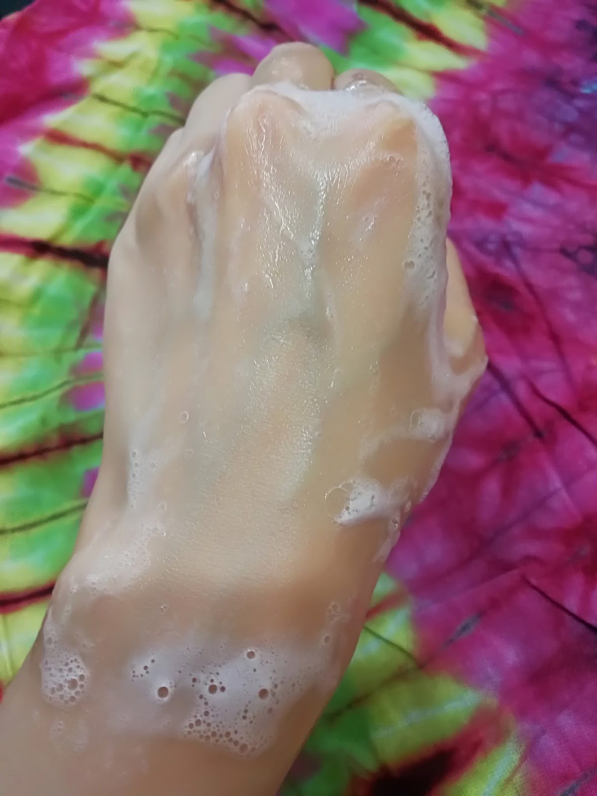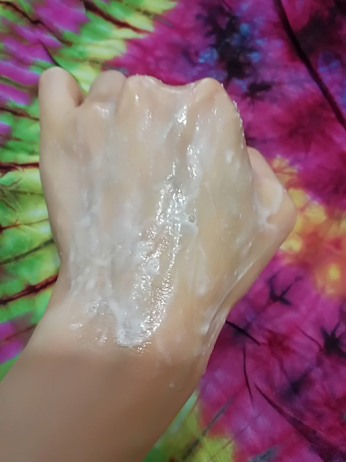微細磨沙粒子味道芳香清,磨沙質地呈水狀,不用加水已可以打圈按摩溫和地祛除死皮,最後用清水沖洗乾淨。