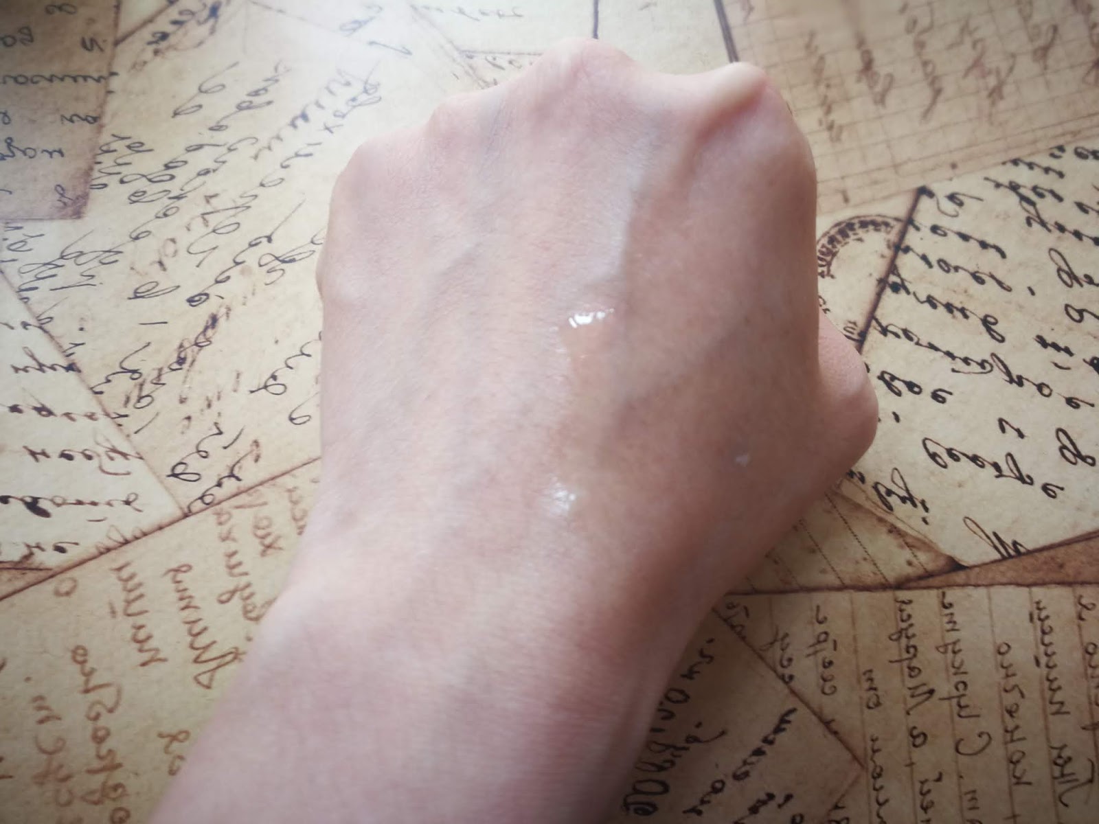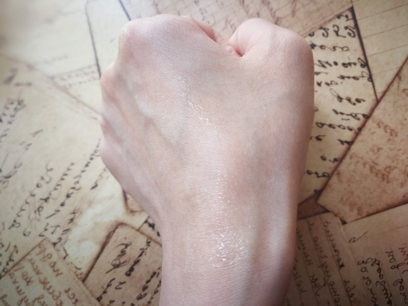 於手部試上精華透明狀質地水潤,輕輕一推即可均勻塗抹。