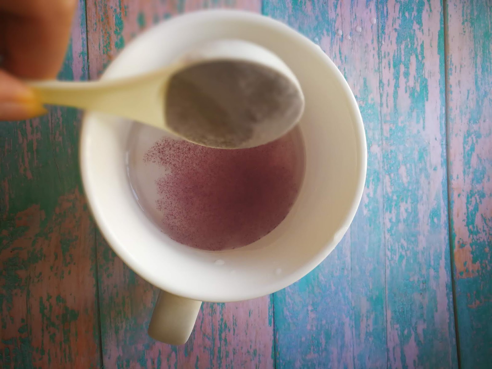 每日建議服10克(約1茶匙)加入100毫升水或者凍水攪拌即成美味野雜莓抗氧果昔。