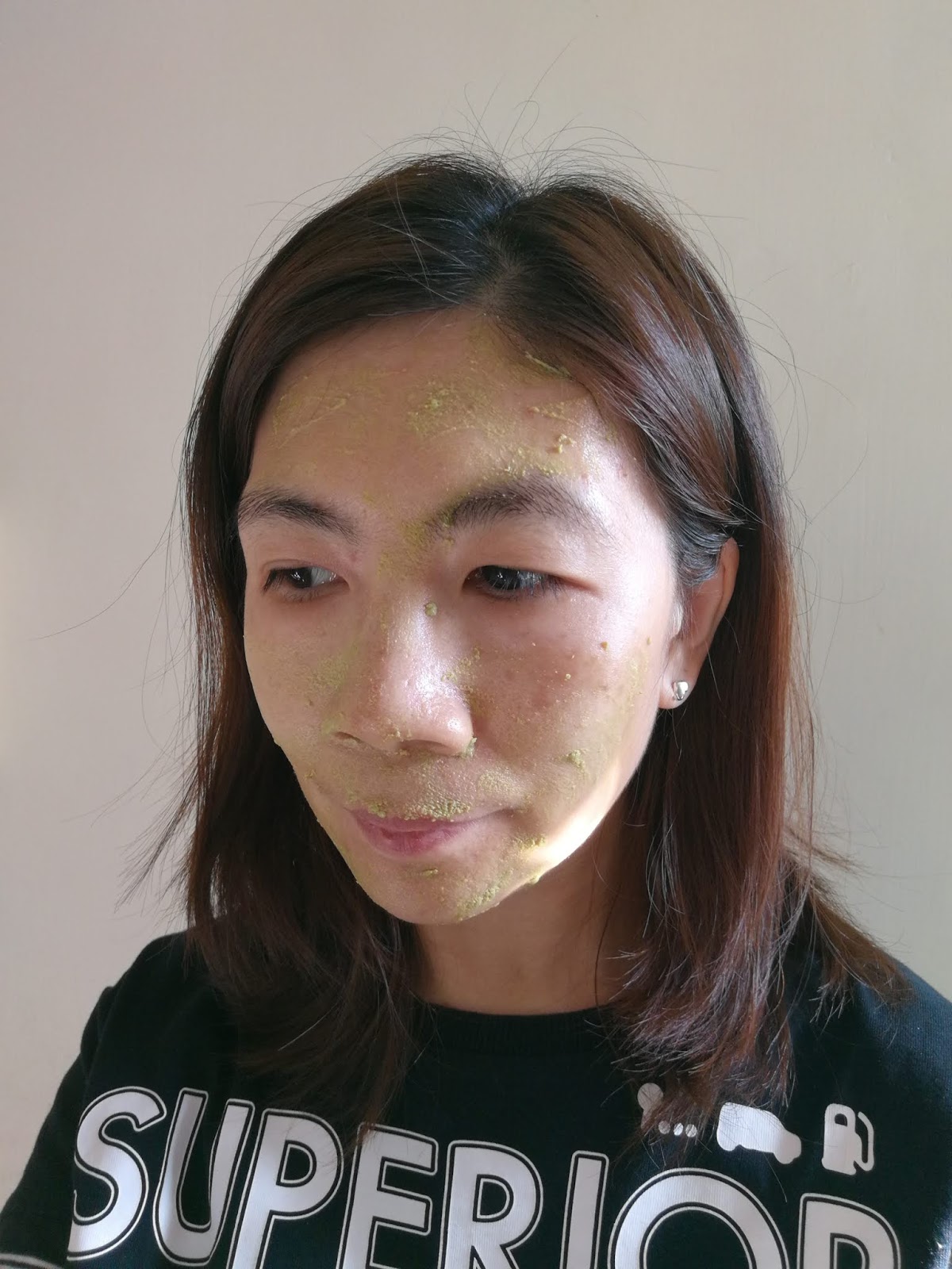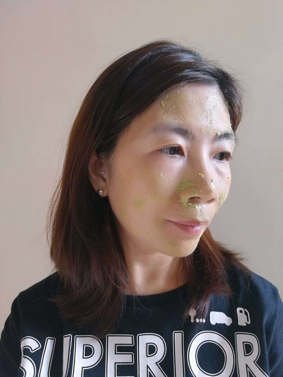 於肌膚敷上一層厚而均勻的面膜,避開眼部位置,好像真的牛油果敷於臉上。